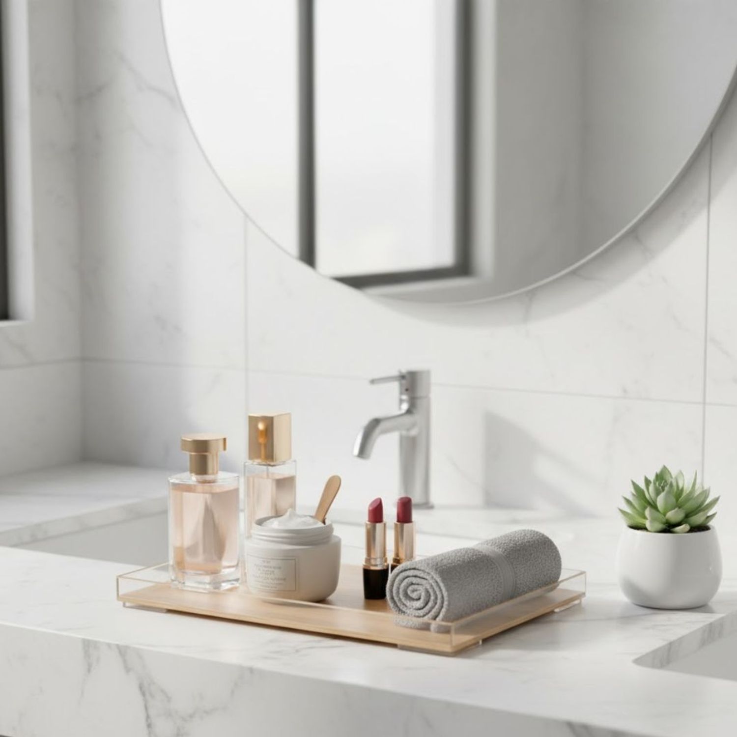 Banheiro e Lavabo: Organize perfumes, cosméticos, sabonetes líquidos e cremes de forma elegante, crie um "kit" de toalhas de mão, mantenha a bancada limpa e os itens essenciais sempre à mão.