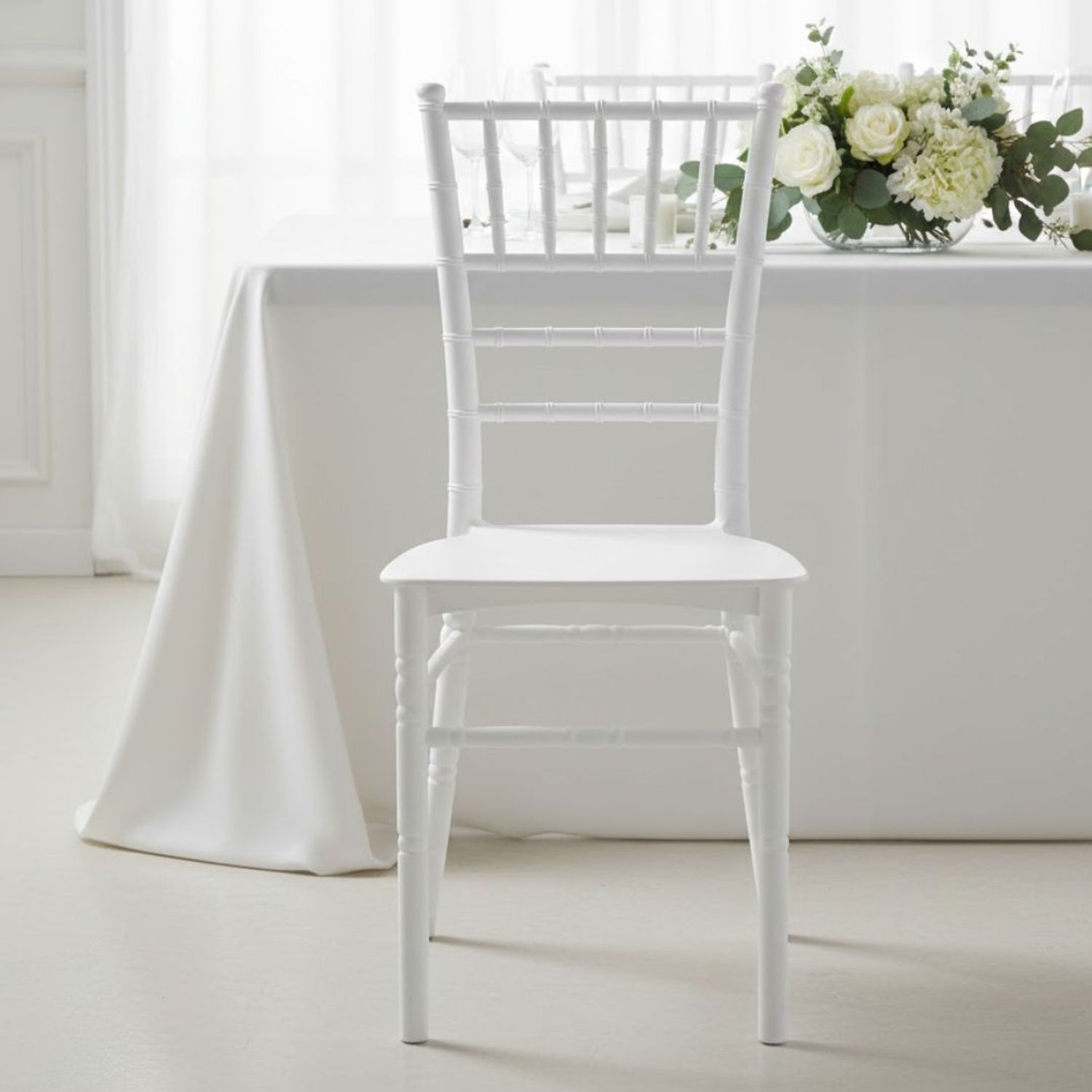 Seu design empilhável a torna prática para armazenamento e transporte, enquanto seu acabamento em plástico branco combina elegância com resistência. Perfeita para diversos tipos de eventos, tanto em ambientes internos quanto externos, e também para uso em penteadeiras.
