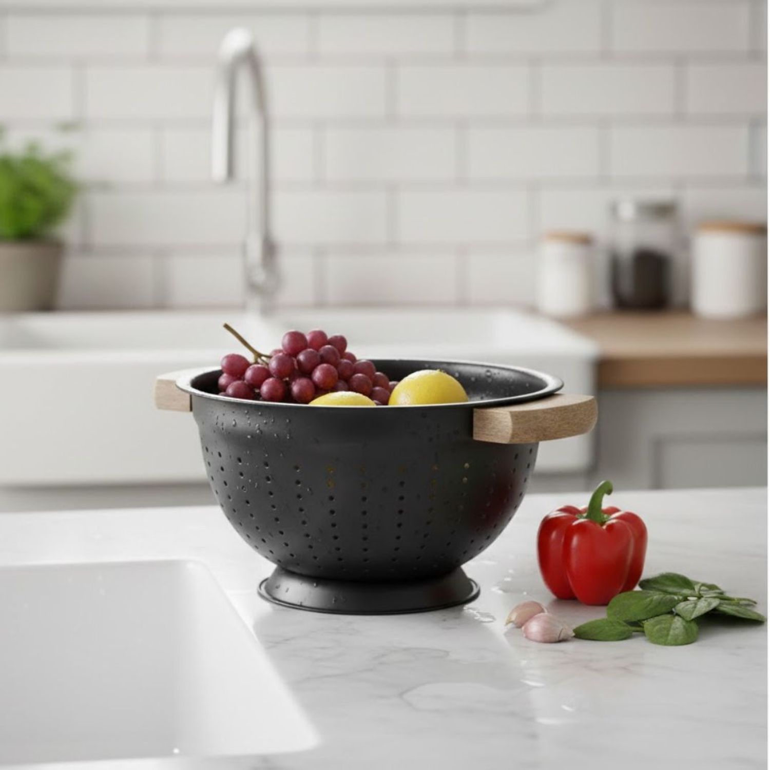 Parceiro ideal para a sua cozinha, fabricado em aço inox durável pintado na cor preta, garantindo uma vida útil prolongada, perfeito para escorrer uma variedade de alimentos, desde massas até frutas, verduras, legumes.