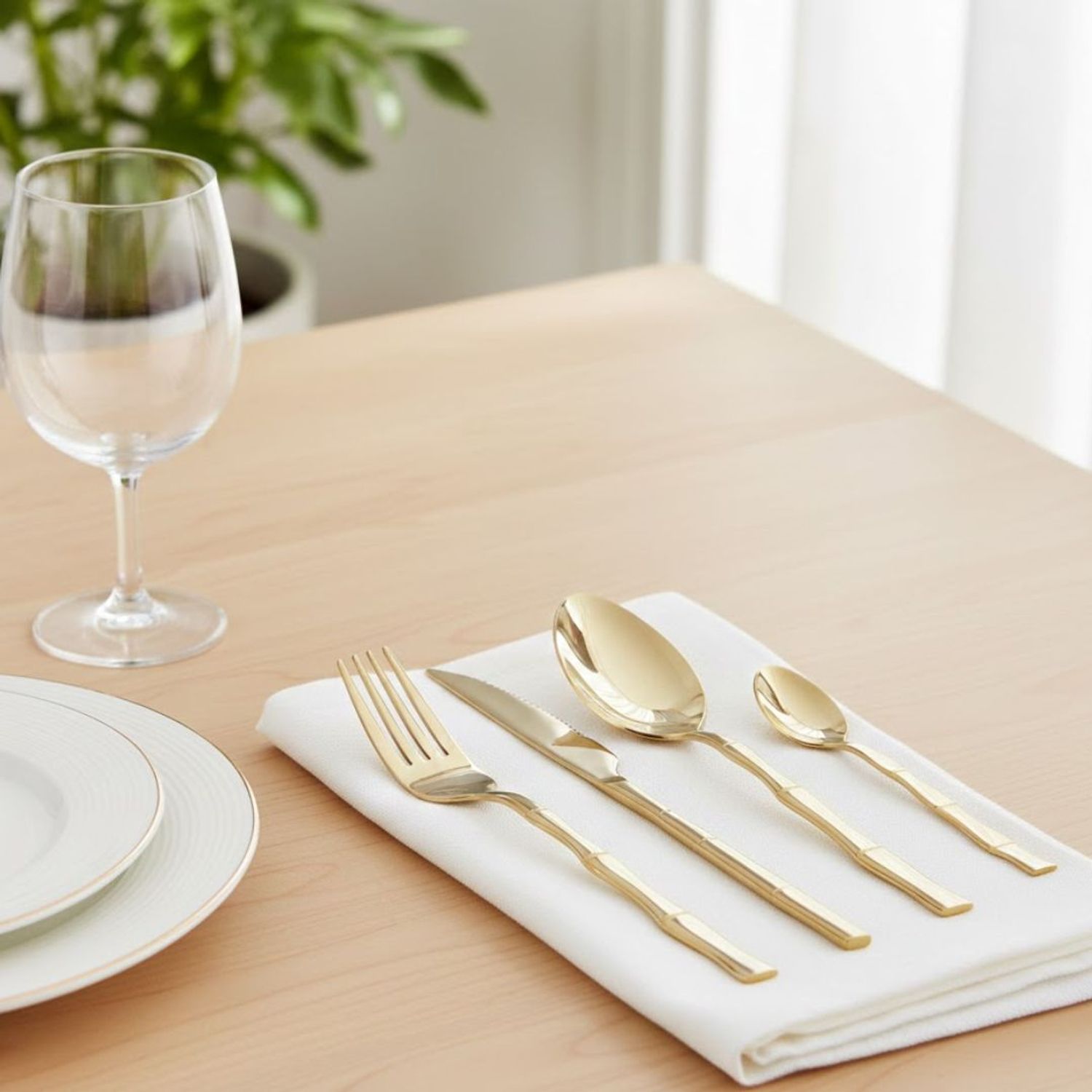 Design Sofisticado: Os talheres apresentam um design exclusivo com detalhes em relevo no cabo que simulam a textura do bambu, conferindo uma elegância atemporal à peça. O acabamento em aço inox de alto brilho complementa o visual de forma requintada.