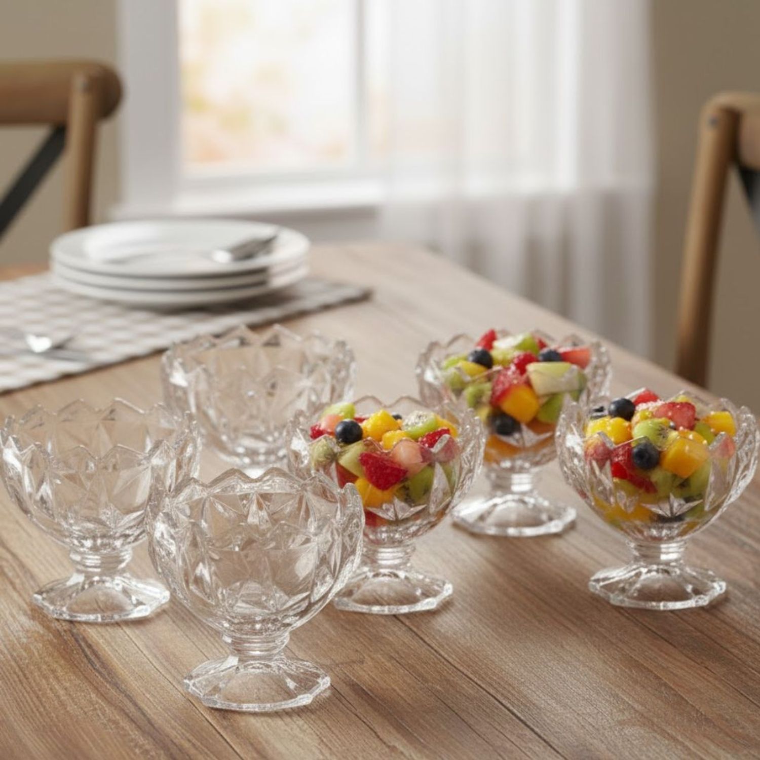 Estabilidade: O pé facetado e robusto garante estabilidade e confere um visual clássico de taça de sobremesa.