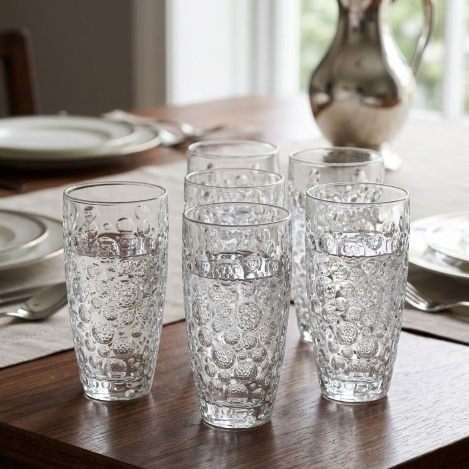 Escolha perfeita para quem busca aliar funcionalidade e um design moderno à mesa, composto por 6 peças de 320ml, este conjunto se destaca pela sua textura em relevo de "bolhas" que além de proporcionar um visual sofisticado, garante uma pegada mais firme e confortável.