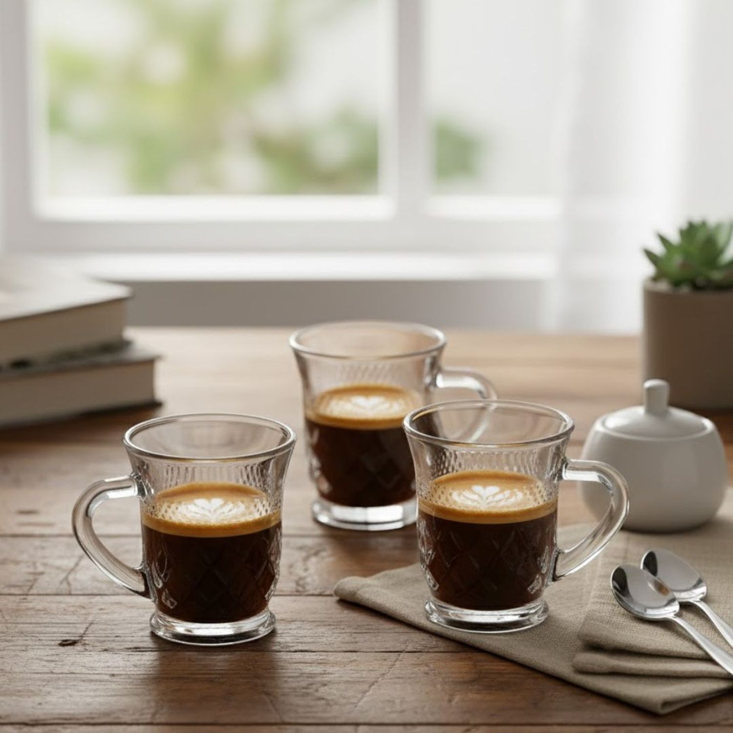 Funcionalidade e Conforto: Com uma capacidade compacta de 100ml, estas canecas são perfeitamente dimensionadas para bebidas concentradas. A alça de vidro robusta oferece um manuseio confortável e seguro, ideal para degustar líquidos quentes.