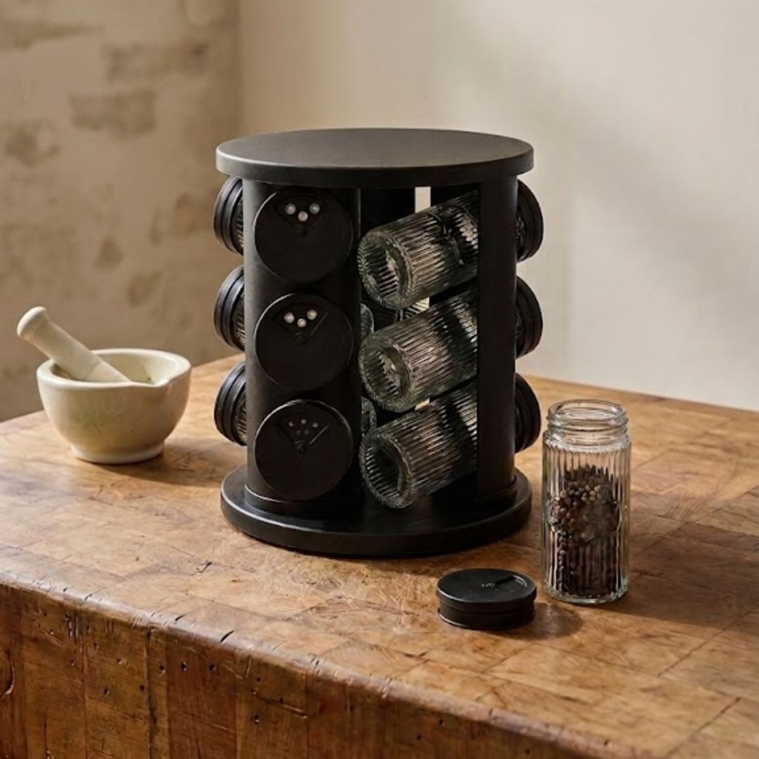 Organize sua cozinha com sofisticação e praticidade. O Porta Temperos Giratório DCasa une design moderno em acabamento preto fosco com a funcionalidade que todo amante da culinária precisa.
