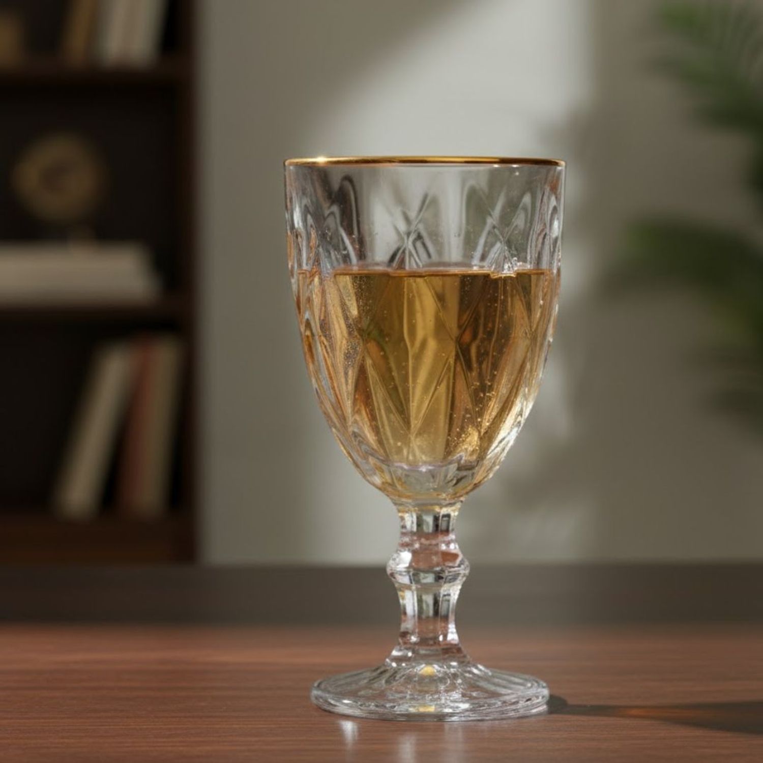 Detalhe decorativo com visual clássico e textura em relevo que remete a um diamante lapidado, conferindo um brilho único e uma pegada confortável. O acabamento em Fio de Ouro na borda realça o contorno da peça com elegância, adicionando luxo discreto e sofisticado. Transparente, leve e resistente, a Taça Diamond é perfeita para complementar qualquer mesa, do casual ao formal.