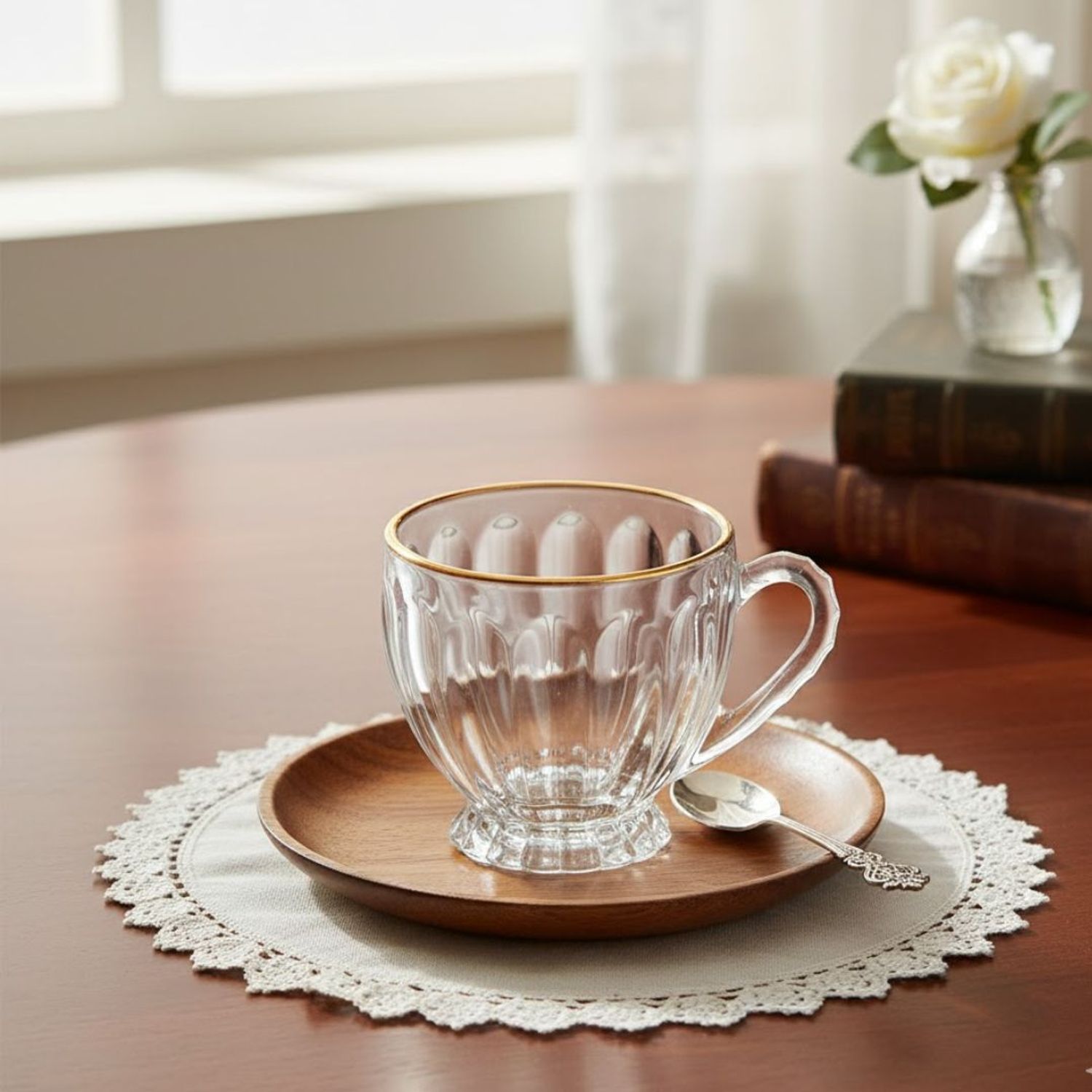 Produzida em cristal transparente, leve e resistente, a peça apresenta um encantador detalhe decorativo em relevo com visual clássico que realça o brilho e a transparência do material. O contorno da borda é valorizado por um acabamento em Fio de Ouro, adicionando requinte sem exageros.